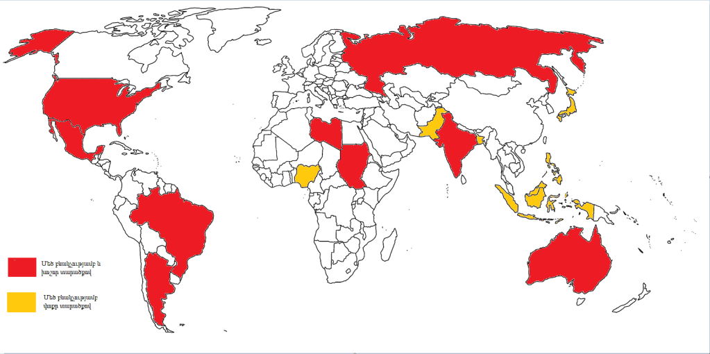 Չինաստան,Հնդկաստան,Կանադա,ԱՄՆ,Ավստրալիա,Սուդան,Լիբիա,Ալժիր,Արգենտինա,Բրազիլիա,Ռուսաստան,Ղազախստան,Իրան,Սաուդյան Արաբիա,Մեքսիկա