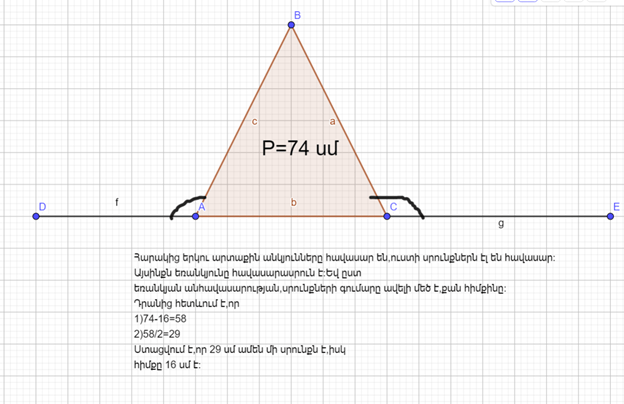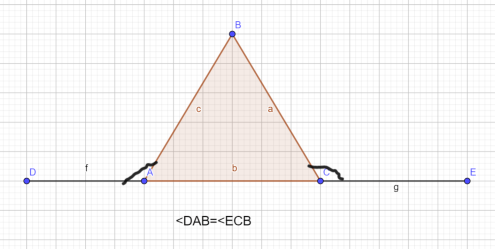 Քանի որ արտաքին անկյունները հավասար են ապա <A = <C => Եռանկյուն ABC հավասարասրուն է։