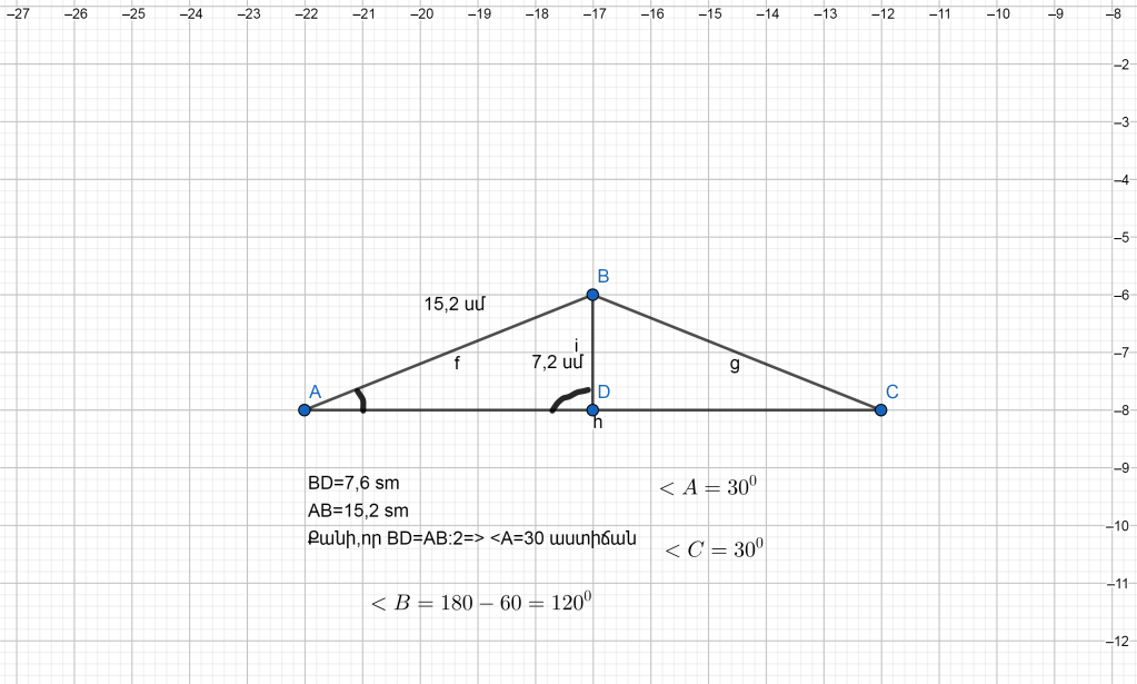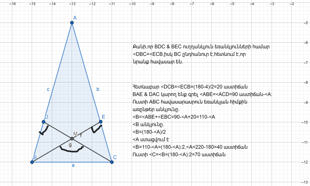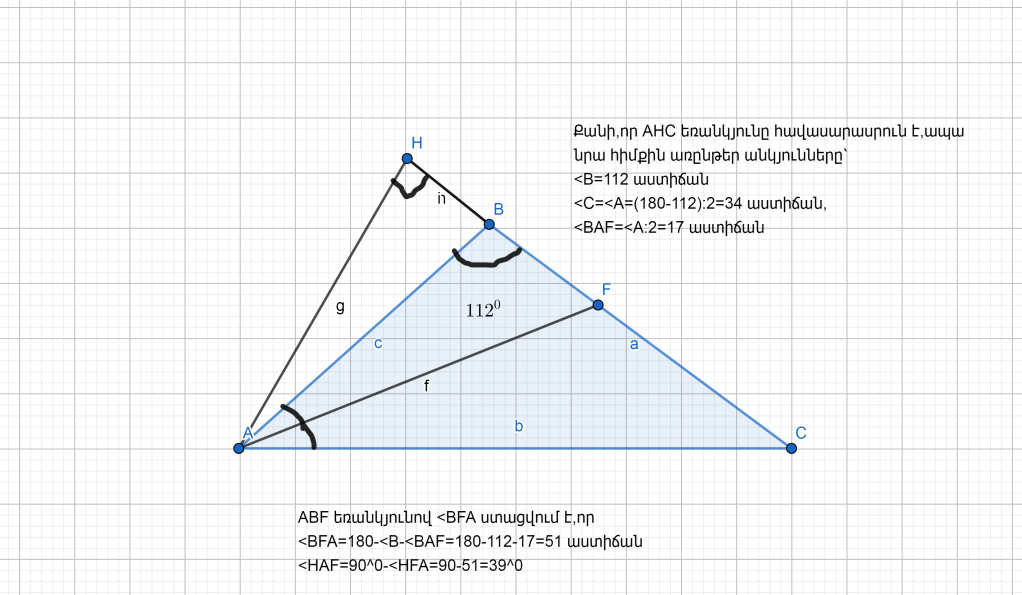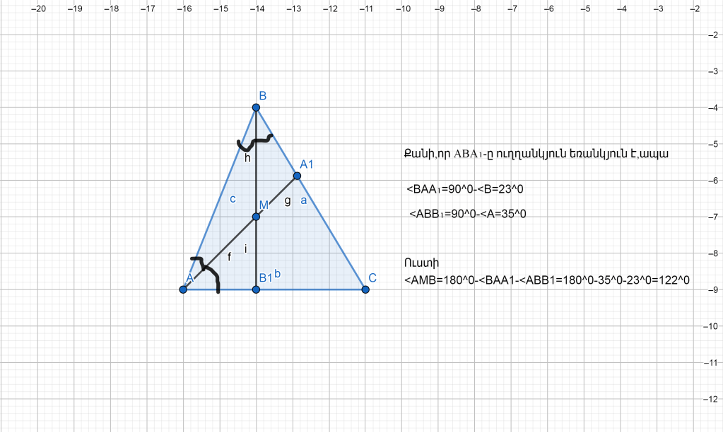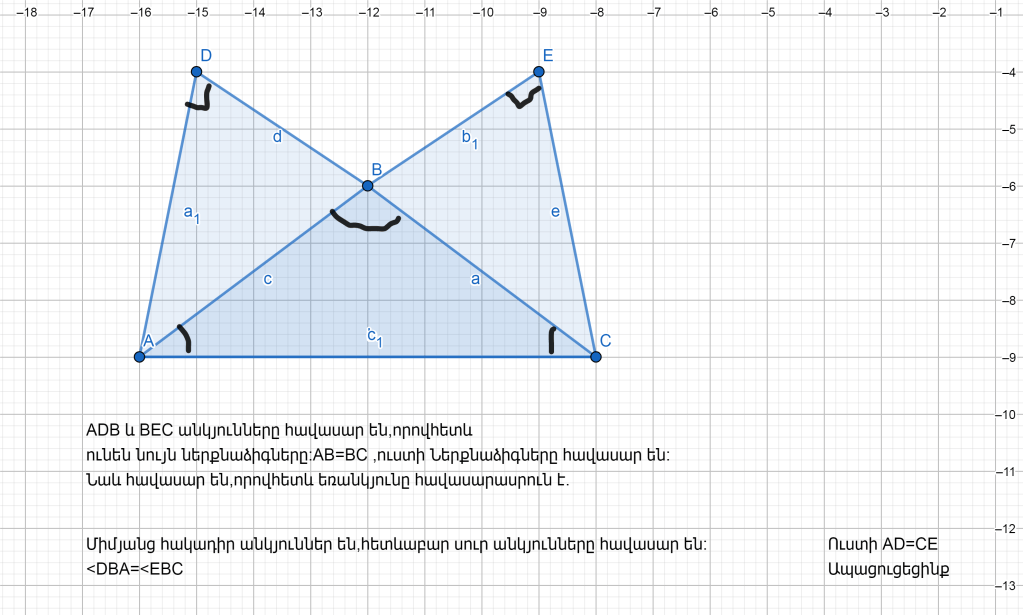 Քանի,որ <B=<B1,հետևաբար <ABD=<A1B1D1: Հետևաբար ABD և A1B1D1 եռանկյունները՝որպես ուղղանկյուն եռանկյուններ,որոնք ունեն հավասար ներքնաձիգներ և հավասար սուր անկյուններ,ուստի կլինեն հավասար:Հետևաբար AB=A1B1,ուստի ABC և A1B1C1 եռանկյուններն,ըստ եռանկյունների հավասարության երկրորդ հայտանիշի կլինեն հավասար AB = A1B1 ,ուստի <ABD=<A1B1D1 ,<A=<A1 = 900: