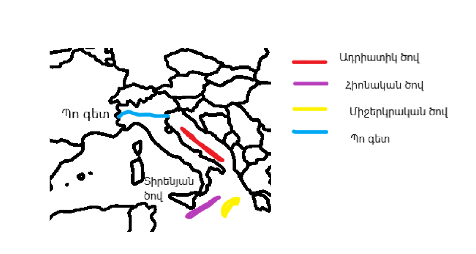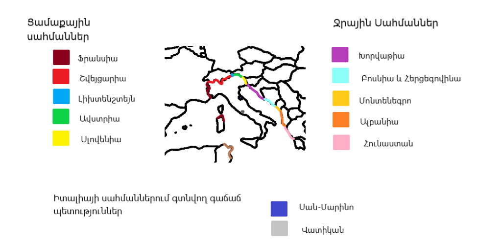 4․Ուրվագծային քարտեզի վրա նշել Իտալիայի հարևան պետությունները, ափերը ողողող ջրային ավազանները, արդյունաբերական խոշոր կենտրոնները:
