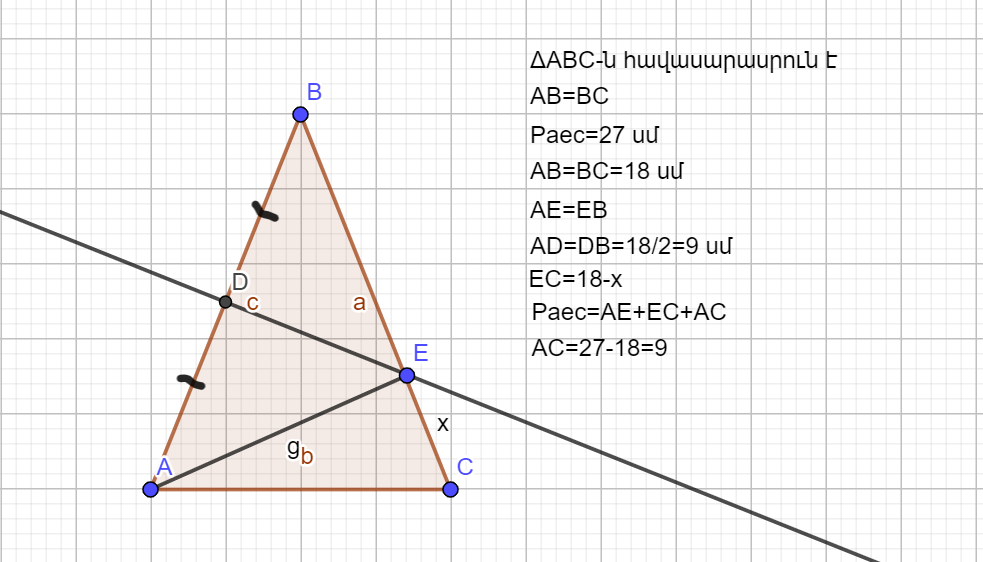 Քանի, որ ADB-ն հավասարասրուն է, ուստի DE բարձրություն է, միջնագիծ է ու կիսորդ է։