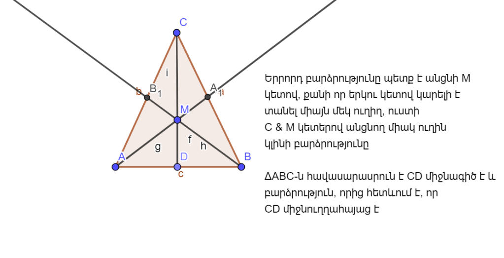 Երրորդ կիսորդը նույնպես պետք է անցնի M կետով։ ABC եռանկյունը հավասարասրուն է, որից հետևում է, որ CD-ն բարձրություն է և միջնագիծ, ուստի CD-ն միջնուղղահայաց ուղիղ է։