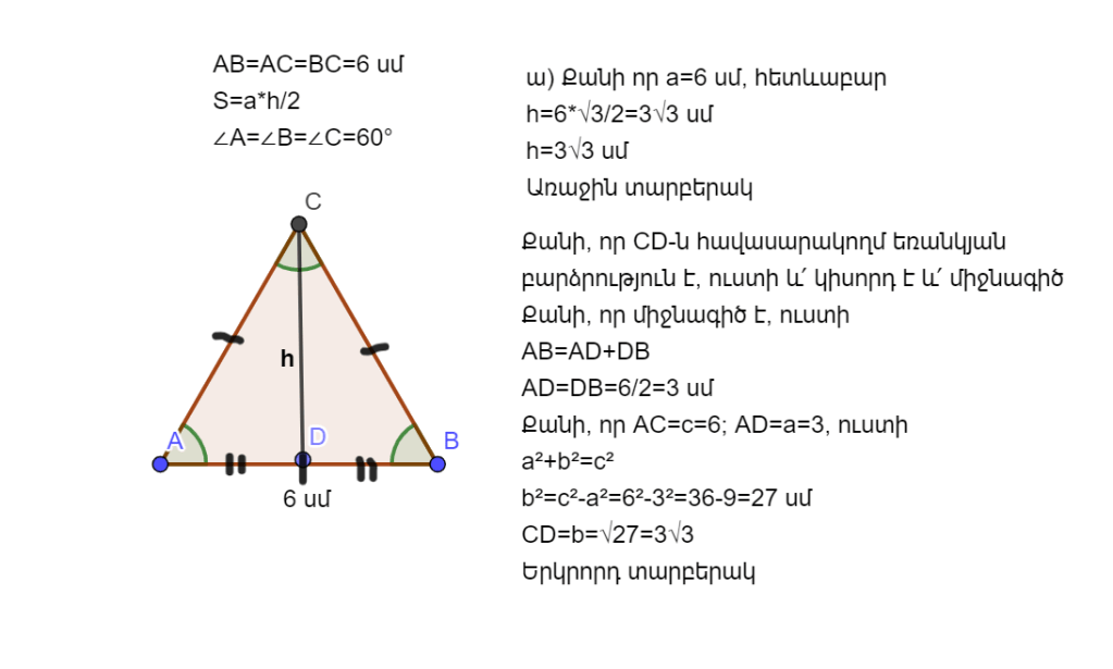 ա) հավասարակողմ եռանկյան բարձրությունը, եթե նրա կողմը 6 սմ է։