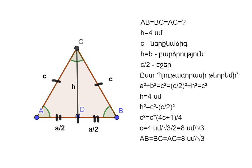 բ) հավասարակողմ եռանկյան կողմը, եթե բարձրությունը 4 սմ է։