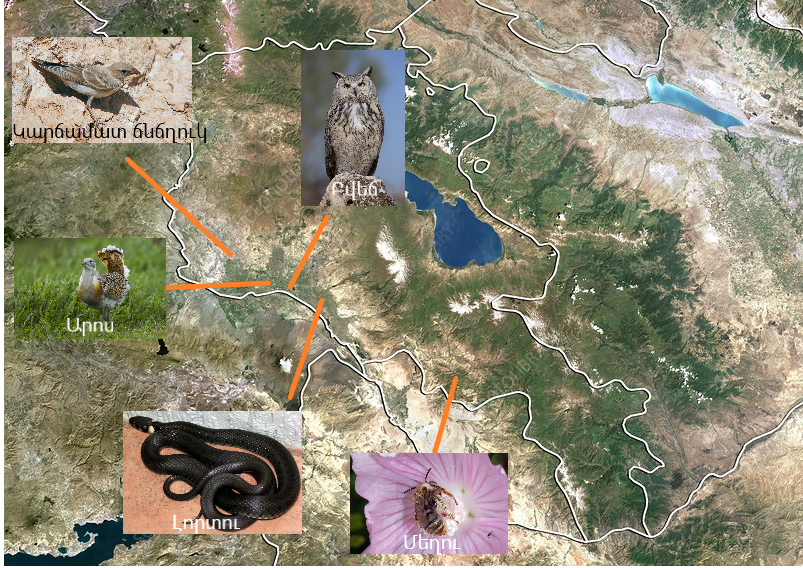 Կարմիր գրքում ընդգրկված կենդանիներից, որոնք բնակվում են անապատակիսաանապատային լանդշաֆտում սովորական տրիտոնն է, որը այստեղ հազվադեպ է հանդիպում։ Բույսերից՝ Անթառամը, Ադիանտում Վեներայի վարսը, Ազազու օշինդրանմանը, Ալոխրուզա Թախտաջյանի, Ալոճ Շովիցի, Ակտինոլեմ խոշորաբաժակ բույսը, Աղածաղիկը, Աղածաղիկ կուլապականը, Աղահասկիկը, Աղահասկիկ Բելանժեին, Այծակնը, Այծակն հաստը, Անթեմ կովկասյանը, Աննշմարակող անհարթապտուղը, Անողնուցուկ Գրոսհեյմին, Աշորան, Առյուծաթաթ հայկականը, Ասպերուգինոիդես անութայինը, Աստղաշուշանը, Արմատագլխիկ արևելյանը, Արոսենի կովկասյանը, Արքայածաղիկը, Բիբերշտեյնիա բազմաբաժանը, Բիեներցիա շուրջաթևը, Բոգ Օլիվյեին, Բորակաթուփը, Գազ ամբողջատերևը, Գազ արծվասարայինը, Գազ բծավորը, Գազ խառն, Գազ խզմզաբաժակը, Գազ կարակուշին, Գազ կնճռոտը, Գազ կորաեղջյուրավորը, Գազ կորասերմը, Գազ Ղարաբաղին, Գազ տարօրինակը, Գեղածնկիկ մատիտեղանմանը, Գլխակտուց Կիրպիչնիկովին, Գինեծաղիկ գազարատերևը, Դոդոշախոտ Թախտաջյանին, Դևագի աղուտայինը, Դևագի հատվածը, Երեքօրնիկ պարսկականը, Երկպտղիկ սեղմվածը, Երուկաստրում Թախտաջյանին, էնդեմիկ բույսերից՝ տանձենին, խնձորենին, սալորենին, շլորի ծառը։ Կարմիր գրքում գրանցվածներից են նաև Թանթռնիկ քառաչափը, Թեզիում սեղմվածը, Թեզիում Սովիչին, Ժոբերցիա Սովիչին, Իշակաթնուկ հալեպականը, Իշամառոլ արարատյանը, Լեպտունիս մազանմանը, Խթանաբույս երկարածաղիկը, Խինձ գորովանին և Խինձ Շովիցին։