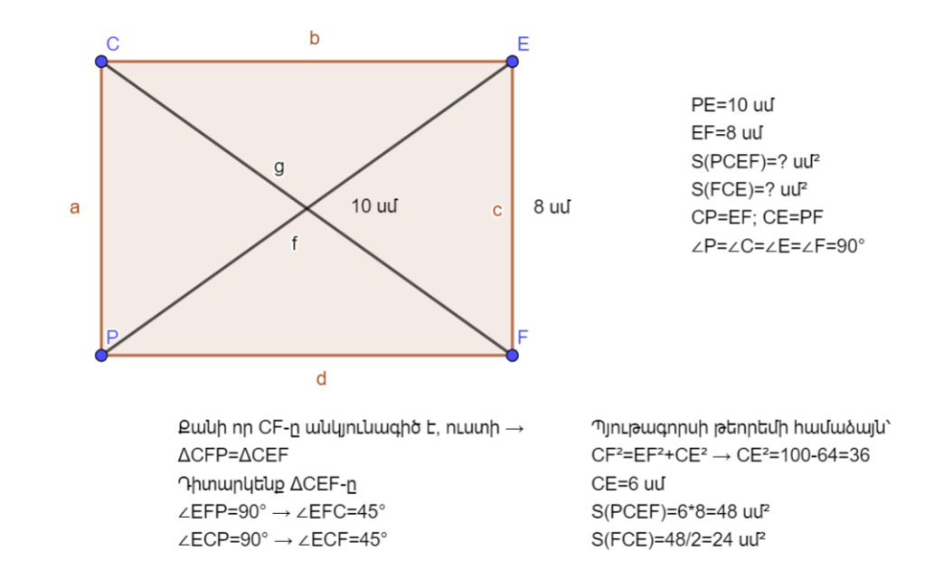 1) PCEF ուղղանկյան անկյունագիծը 10 սմ է, իսկ կողմերից մեկը՝ 8 սմ։ Գտնել PCEF ուղղանկյան մակերեսը և ΔFCE-ի մակերեսը։