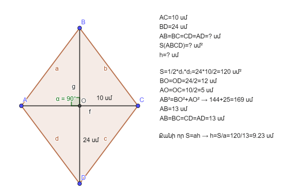 2) Շեղանկյան անկյունագծերը 24 սմ և 10 սմ են։ Գտնել շեղանկյան կողմը, մակերեսը, բարձրությունը։