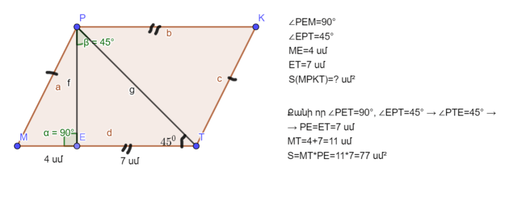 3) MPKT զուգահեռագծի MT կողմի վրա նշված է E կետն այնպես, որ ∠PEM=90°, ∠EPT=45°, ME=4 սմ, ET=7 սմ։ Գտնել զուգահեռագծի մակերեսը։