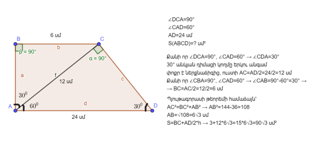 4) ABCD ուղղանկյուն սեղանի AC անկյունագիծն ուղղահայաց է CD սրունքին և AD հիմքի հետ կազմում է 60°-ի անկյուն։ Գտնել սեղանի մակերեսը, եթե AD=24 սմ։