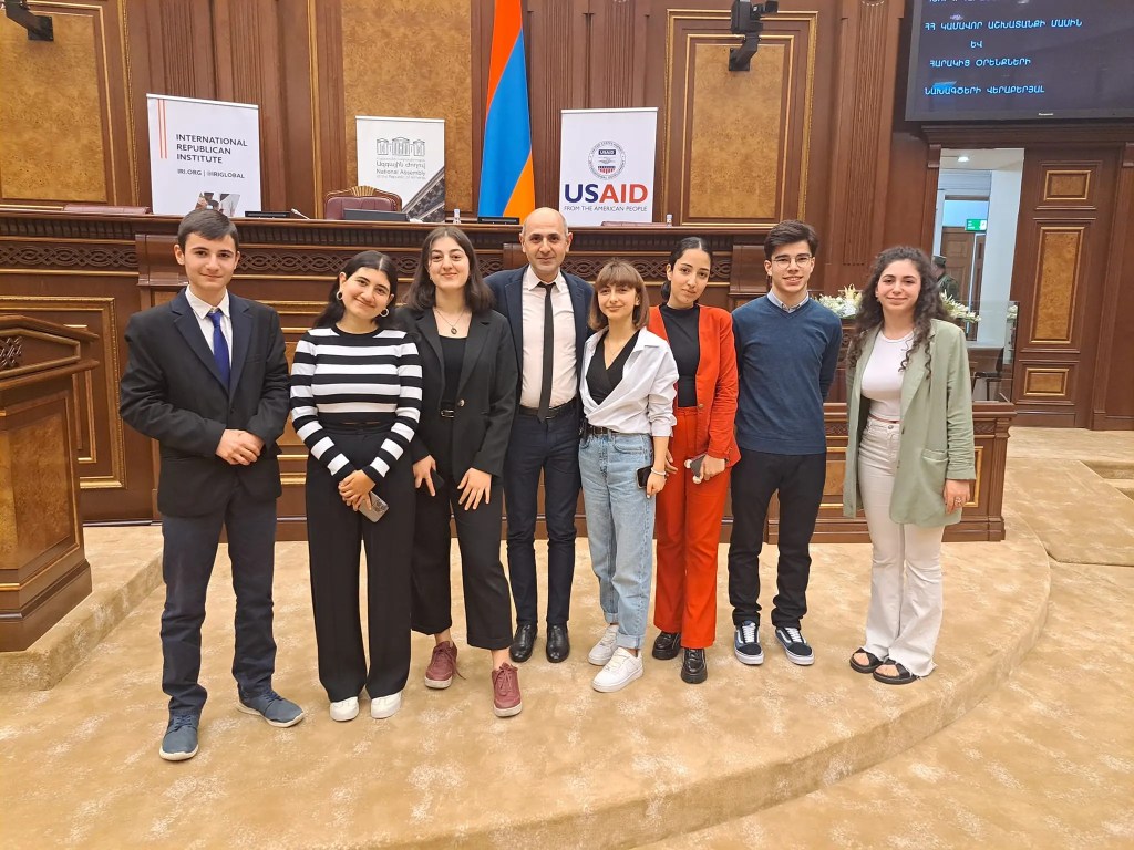 Մայիսի 10-ին՝ չորեքշաբթի օրը, պատմության և հասարակագիտության դասավանդող Վարդան Կարապետյանի գլխավորությամբ մի խումբ սովորողներով ուղևորվեցինք Հայաստանի Հանրապետության բարձրագույն օրենսդիր մարմին՝ Ազգային ժողով։ Այնտեղ մասնակցեցինք ԱԺ-ի «Աշխատանքի և սոցիալական հարցերի» մշտական հանձնաժողովի նախաձեռնած խորհրդարանական լսումներին։ Քննարկումը «Կամավոր աշխատանքի մասին» օրենքի փոփոխությունների վերաբերյալ էր։