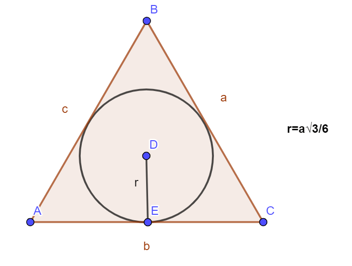 Հավասարակողմ եռանկյանը ներգծած շրջանագծի շառավիղը հաշվվում է հետևյալ բանաձևով. r=a*√3/6