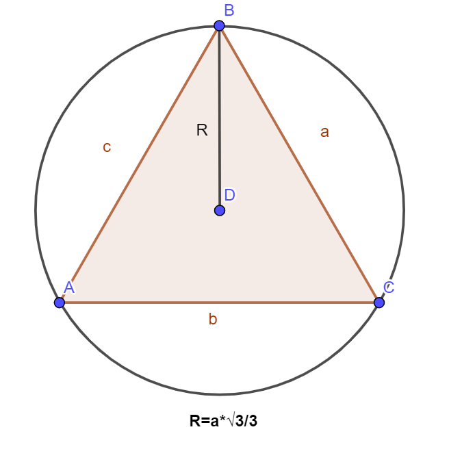 Հավասարակողմ եռանկյանն արտագծած շրջանագծի շառավիղը հաշվվում է հետևյալ բանաձևով. R=a*√3/3