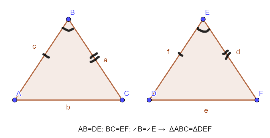 I հայտանիշ․ Եթե մի եռանկյան երկու կողմերը և դրանցով կազմված անկյունը համապատասխանաբար հավասար են մյուս եռանկյան երկու կողմերին և դրանցով կազմված անկյանը, ապա այդպիսի եռանկյունները հավասար են: