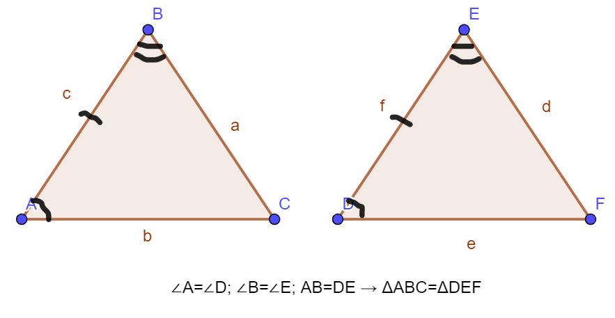 II հայտանիշ․ Եթե մի եռանկյան կողմն ու նրան առընթեր երկու անկյունները համապատասխանաբար հավասար են մյուս եռանկյան կողմին և նրան առընթեր երկու անկյուններին, ապա այդ եռանկյունները հավասար են: