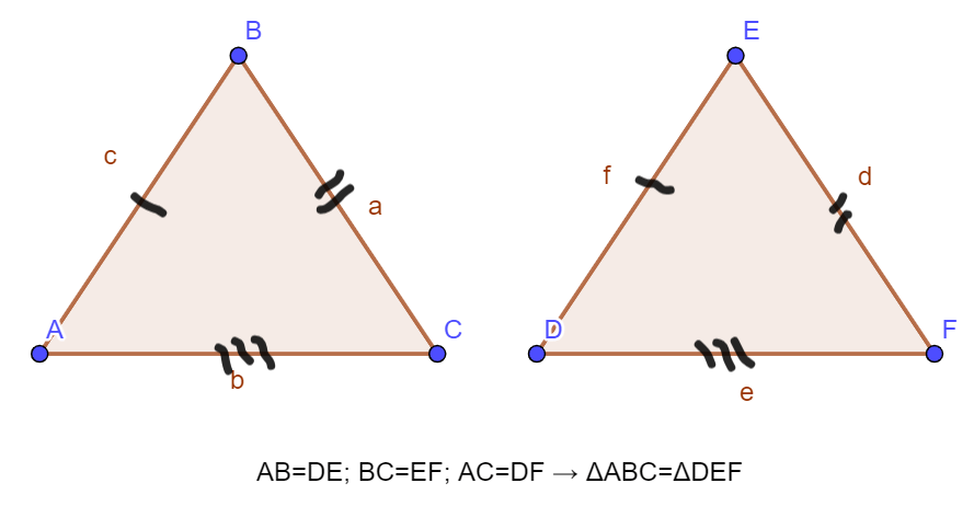III հայտանիշ․ Եթե մի եռանկյան երեք կողմերը համապատասխանաբար հավասար են մյուս եռանկյան երեք կողմերին, ապա այդ եռանկյունները հավասար են: