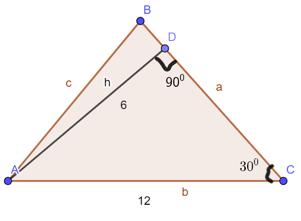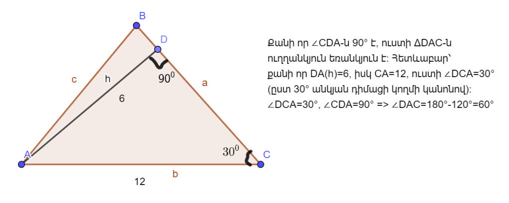 Քանի որ ∠CDA-ն 90° է, ուստի ΔDAC-ն ուղղանկյուն եռանկյուն է։ Հետևաբար՝ քանի որ DA(h)=6, իսկ CA=12, ուստի ∠DCA=30° (ըստ 30° անկյան դիմացի կողմի կանոնով)։ ∠DCA=30°, ∠CDA=90° => ∠DAC=180°-120°=60°