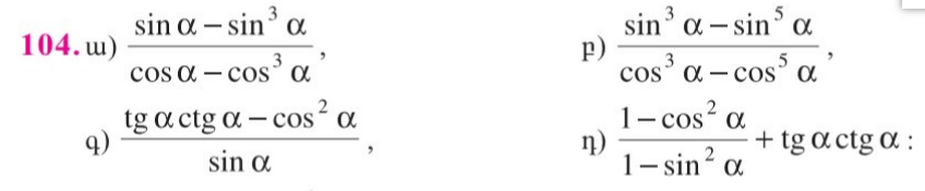 ա) sin α — sin3 α/cos α — cos3 α = sin α*(1-sin2 α)/cos α*(1-cos2 α)=sin α * cos2 α/cos α * sin2 α=tg α*ctg2 α=ctg α