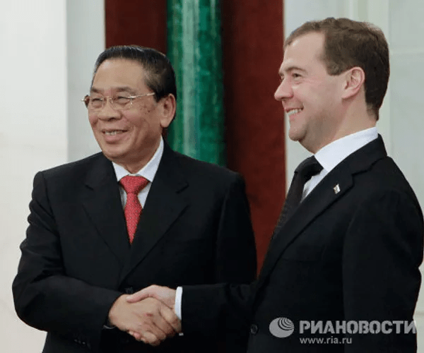 13 հոկտեմբերի, 2011. Ռուսաստանի նախագահ Դմիտրի Մեդվեդևը և Լաոսի նախագահ Թումալի Սաինյասոնը (աջից ձախ) մասնակցում են Կրեմլում ռուս-լաոսական բանակցություններից հետո համատեղ փաստաթղթերի ստորագրման արարողությանը։