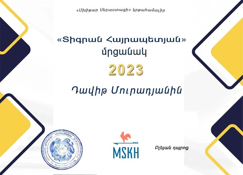 Ողջույն, Ես Մուրադյան Դավիթն եմ։ Ծնվել եմ 2008 թվականի ապրիլի 3-ին, Երևանում։ Մինչ «Մխիթար Սեբաստացի» կրթահամալիր տեղափոխվելը սովորել եմ «Մակսեդան» դպրոցում, որը գտնվում է Արցախի փողոցում։ Միշտ առանձնացել եմ յուրահատուկ մոտեցմամբ, ուսման մեջ առաջխաղացմամբ։ «Մխիթար Սեբաստացի» կրթահամալիր տեղափոխվել եմ 2020 թվականի հունվար ամսին։ Պետք է նշեմ, որ իմ տեղափոխվելու պատճառներից էին ուսման բարելավումը, նոր շրջապատի և ընկերների ձեռքբերումը, ինքնաարտահայտվելու կարողության և ունակության խթանումը։