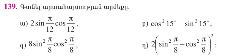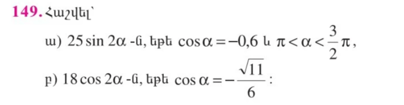 Թեմա՝ Կրկնակի անկյան եռանկյունաչափական ֆունկցիաների հատկություն դասագիրք՝ առաջադրանք ․138-149