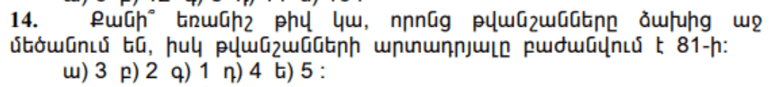 Որպեսզի թվի թվանշանների արտադրյալը բաժանվի 81-ի, պետք է, որ թվի յուրաքանչյուր թվանշան լինի 81-ի բաժանարարներից մեկը։ Բաժանարարներն են՝ 1, 3, 9, 27, 81։ Այսպիսով, մենք ունենք երեք եռանիշ թվեր, որոնք համապատասխանում են՝ 279, 189 և 369։