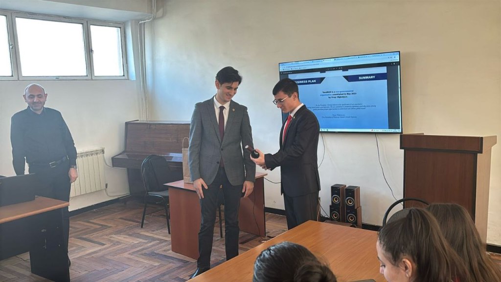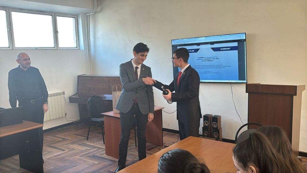 Այնուհետև խոսքը փոխանցվեց YereMUN (Yerevan Model United Nations) հասարակական կազմակերպության նախագահ Վրույր Հլղաթյանին։ Մեր հյուրը, շնորհակալություն հայտնելով մեծ լսարանի առջև ելույթ ունենալու ընձեռված հնարավորության համար, նախևառաջ ներկայացավ, պատմեց իր մասնագիտական գործունեության, աշխատանքի և ուսումնառության մասին։